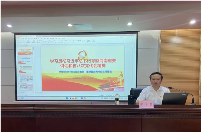 為推進(jìn)“能力提升建設(shè)年”活動(dòng)走深走實(shí),省供銷社搭建“海南供銷合作大講堂”平臺(tái),省社領(lǐng)導(dǎo)班子以上率下,鼓勵(lì)中層業(yè)務(wù)骨干、青年干部走上講臺(tái),以講促學(xué)提素能。6月10日下午,省供銷社黨組書記、理事會(huì)主任張志堅(jiān)圍繞學(xué)習(xí)貫徹習(xí)近平總書記考察海南重要講話和省第八次黨代會(huì)精神—以持續(xù)深化供銷社綜合改革,更好服務(wù)海南自貿(mào)港建設(shè)為題,為省社領(lǐng)導(dǎo)班子成員、機(jī)關(guān)全體黨員、老干部支部黨員代表、省供銷集團(tuán)及社屬企業(yè)全體黨員上了一次專題黨課。