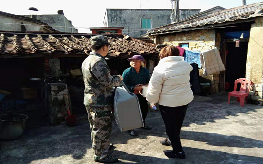 到加橫村慰問低保戶馮桂英,為其發(fā)放救濟物資棉被,馮桂英表示感激政府在寒冷的冬天送來的溫暖。
