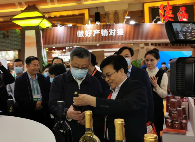 中華全國(guó)供銷(xiāo)合作總社黨組成員、理事會(huì)副主任王偉(左)參觀供銷(xiāo)精品館