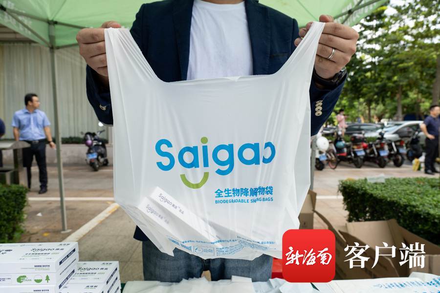 全生物降解的購物袋、快遞包裹袋、垃圾袋、一次性餐盒……多款全生物降解塑料制品出現(xiàn)在海南賽高新材料有限公司的攤點上,吸引了人們的注意。