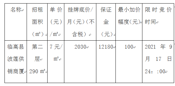為切實加強供銷社社有資產(chǎn)管理,海南省供銷投資管理有限公司就“臨高縣波蓮供銷商廈”第二層面向社會進行公開招租。招租堅持合法、公開、公平、公正的原則,歡迎有關(guān)單位和個人參加競標,現(xiàn)就招租有關(guān)細則如下: